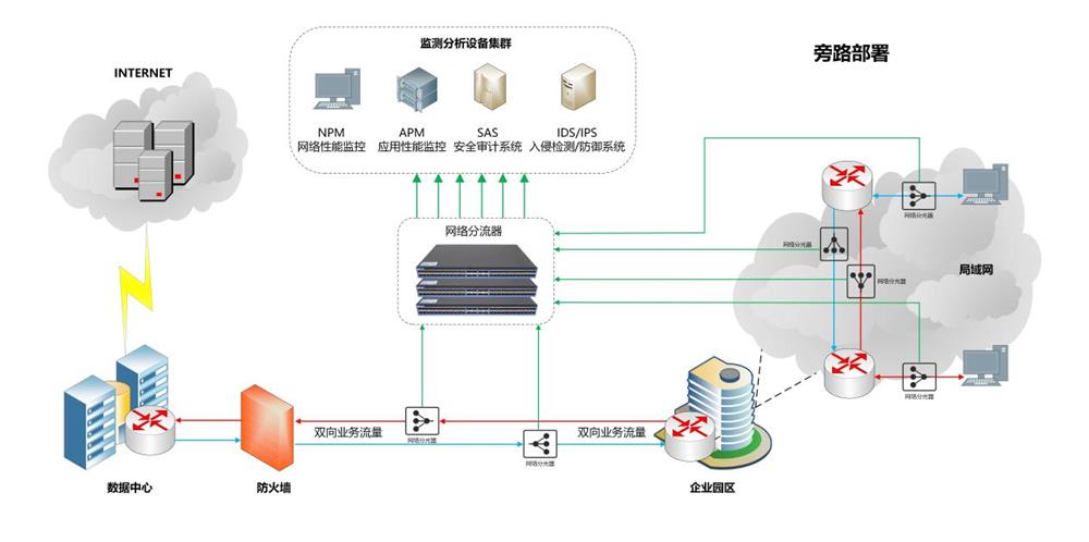 为入侵检测系统(IDS)、入侵防御系统(IPS)、威胁情报分析平台等安全设备提供全量双向流量,可有效检测隐蔽攻击(如APT攻击、数据窃取)